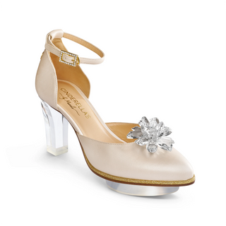 Ein zauberhafter Brautschuh als Peeptoes Riemchenpump von der Firma Cinderella’s by Marcela in Ivory/Perlfarbe mit eleganten Hirschgeweihstickerei, hochwertigem transparentem Absatz und Plateau und einer Brosche. Die Schuhe sind mit silbernen Accessoires verziert, und die Schnalle ist mit funkelnden Steinchen veredelt. Perfekt geeignet für Hochzeiten im Dirndl-Stil sowie für Oktoberfest- oder Trachtenevents.