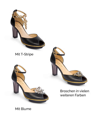 Mit unseren variablen Dekorationselementen passen Sie Ihren Schuh in wenigen Handgriffen an. Der elegante T-Stripe setzt raffinierte Akzente am Knöchel, während die Broschen und Blumen-Varianten den Schuh in eine edle, verspielte oder glamouröse Optik verwandeln. Ob klassisch, modern oder extravagant – durch die vielfältigen Designs und Farben entsteht Ihr ganz persönlicher Stil, passend zu jedem Outfit und Anlass.