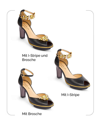 Die Brosche verleiht jedem Dirndl oder festlichen Outfit einen klassischen, traditionellen Akzent. Der I-Stripe betont die elegante Linie und passt ideal zu Abendkleidern und Cocktailmode. Für besonders opulente Auftritte lassen sich Brosche und I-Stripe auch miteinander kombinieren – perfekt zu schlichten, reduzierten Kleidern, bei denen der Schuh zum Statement wird. Alle Varianten lassen sich schnell und einfach austauschen und sorgen für maximalen Gestaltungsspielraum bei höchstem Tragekomfort.
